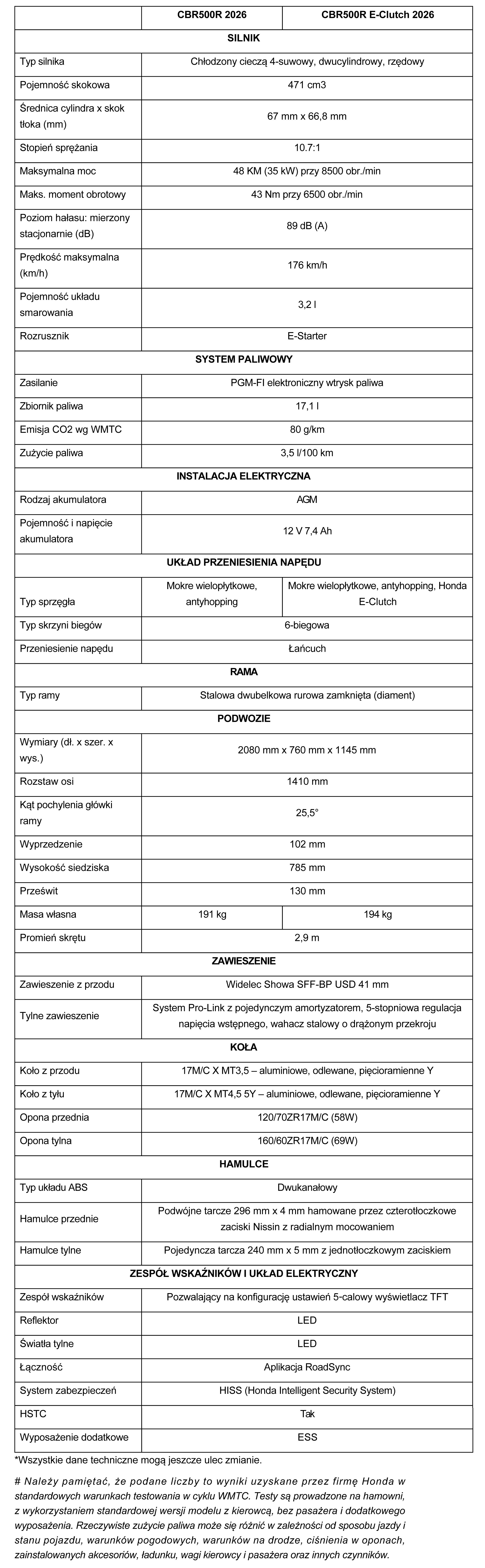 Dwucylindrowy motocykl sportowy Hondy, dostępny dla kierowców z prawem jazdy A2, został w modelu na rok 2026 wzbogacony o system Honda E-Clutch, a nowe opcje kolorystyczne podkreślają odświeżone wzornictwo, nawiązujące do modelu Fireblade z roku 2024. Nowy układ przeniesienia napędu pozwala w pełni wykorzystać potencjał silnika o pojemności 471 cm3, który generuje moc 48 KM (35 kW) i moment obrotowy 43 Nm, gwarantując radość z jazdy zarówno podczas codziennych tras do pracy, jak i na krętych drogach. Seryjne wyposażenie podwozia wysokiej jakości obejmuje 41-milimetrowy widelec Showa SFF-BP USD, tylny amortyzator Showa i podwójne tarcze z przodu z czterotłoczkowymi zaciskami i system kontroli momentu obrotowego (Honda Selectable Torque Control). Podwójny reflektor LED zapewnia lepszą widoczność w nocy, a nowy 5‑calowy ekran TFT oferuje łączność ze smartfonem poprzez aplikację Honda RoadSync, obsługiwaną za pomocą uproszczonego, podświetlanego 4-pozycyjnego przełącznika.