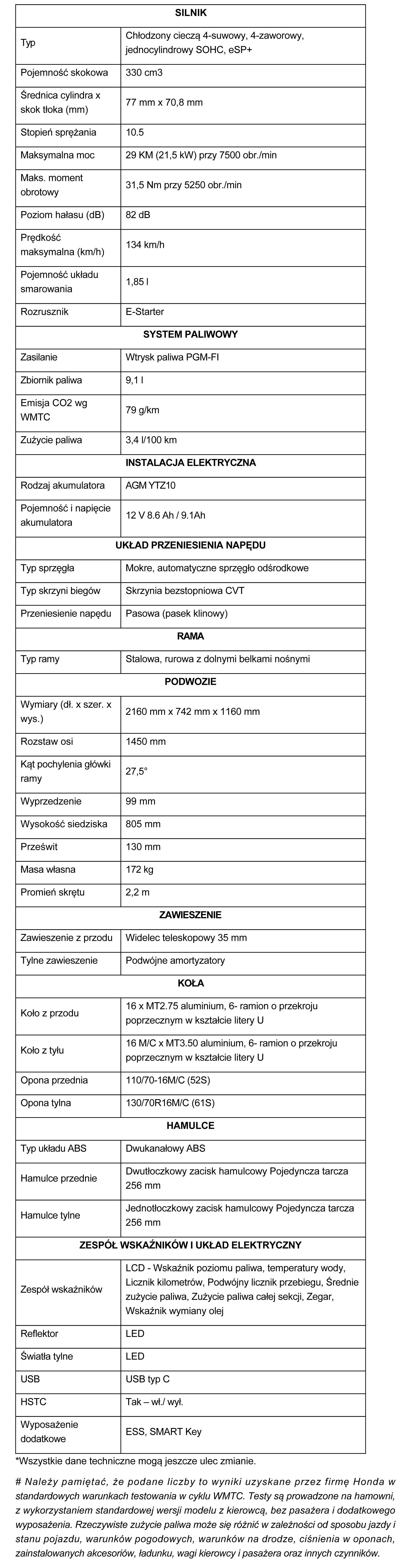 Oczywiście, dla skutera SH funkcjonalność jest równie ważna, jak forma. Pozycja za kierownicą pasuje do szerokiego zakresu gabarytów kierowców, zapewniając zrelaksowaną, wyprostowaną postawę i doskonałą widoczność we wszystkich kierunkach. Całkowita długość skutera wynosi 2160 mm, szerokość 742 mm, a wysokość 1160 mm. Minimalny prześwit to 130 mm.